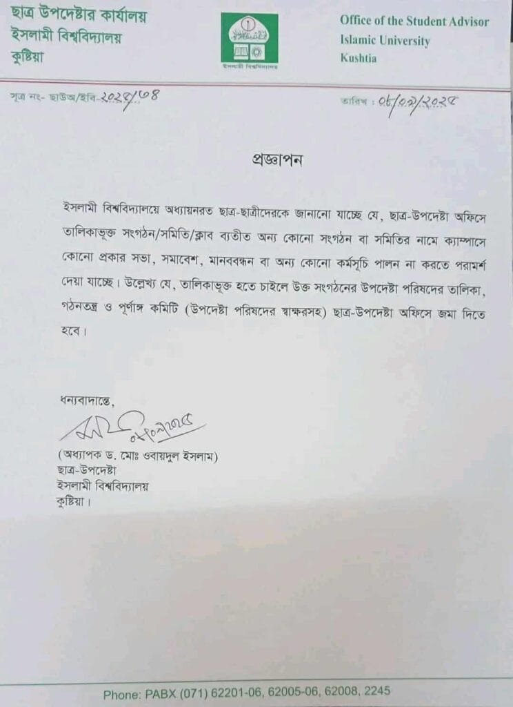 প্রজ্ঞাপনে বলা হয়, ছাত্র-উপদেষ্টা অফিসে তালিকাভূক্ত সংগঠন বা সমিতি বা ক্লাব ব্যতীত অন্য কোনো সংগঠন বা সমিতির নামে ক্যাম্পাসে কোনো প্রকার সভা, সমাবেশ, মানববন্ধন বা অন্য কোনো কর্মসূচি পালন না করতে পরামর্শ দেয়া যাচ্ছে। তালিকাভূক্ত হতে চাইলে উক্ত সংগঠনের উপদেষ্টা পরিষদের তালিকা, গঠনতন্ত্র ও পূর্ণাঙ্গ কমিটি (উপদেষ্টা পরিষদের স্বাক্ষরসহ) ছাত্র-উপদেষ্টা অফিসে জমা দিতে হবে।