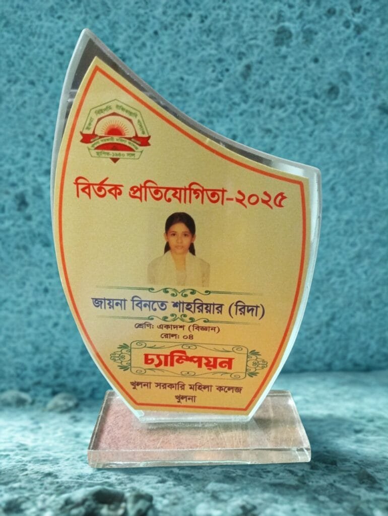 খুলনা সরকারি মহিলা কলেজে আয়োজিত বার্ষিক বিতর্ক প্রতিযোগিতা–২০২৫ এ চ্যাম্পিয়ন হয়েছে একাদশ বিজ্ঞান বিভাগের শিক্ষার্থী জায়না বিনতে শাহরিয়ার রিদা। তার রোল নম্বর—০৪। ব্যক্তিগত পারফরম্যান্সে যেমন উজ্জ্বল সাফল্য দেখিয়েছে, তেমনি তার গ্রুপও প্রতিযোগিতায় চ্যাম্পিয়ন হওয়ার গৌরব অর্জন করেছে।