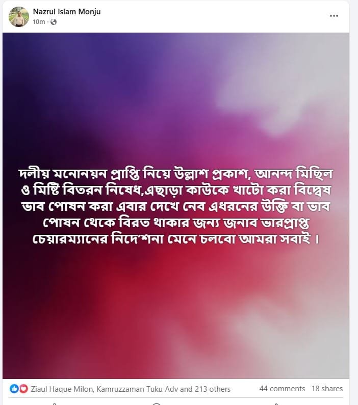 “দলীয় মনোনয়ন প্রাপ্তি নিয়ে উল্লাস প্রকাশ, আনন্দ মিছিল ও মিষ্টি বিতরণ নিষেধ। কাউকে খাটো করা, বিদ্বেষমূলক মনোভাব পোষণ করা বা ‘এবার দেখে নেব’-ধরনের উক্তি থেকে বিরত থাকুন। আমরা সবাই ভারপ্রাপ্ত চেয়ারম্যানের নির্দেশনা মেনে চলব।”