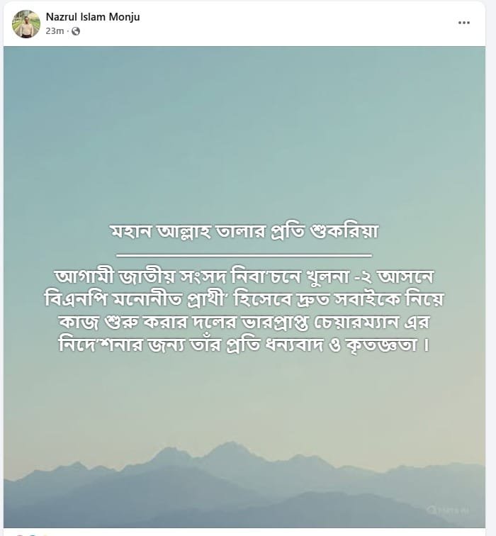 “মহান আল্লাহ তায়ালার প্রতি শুকরিয়া। আগামী জাতীয় সংসদ নির্বাচনে খুলনা-২ আসনে বিএনপি মনোনীত প্রার্থী হিসেবে দ্রুত সবাইকে নিয়ে কাজ শুরু করার জন্য দলের ভারপ্রাপ্ত চেয়ারম্যানের নির্দেশনার প্রতি কৃতজ্ঞতা জানাই।”