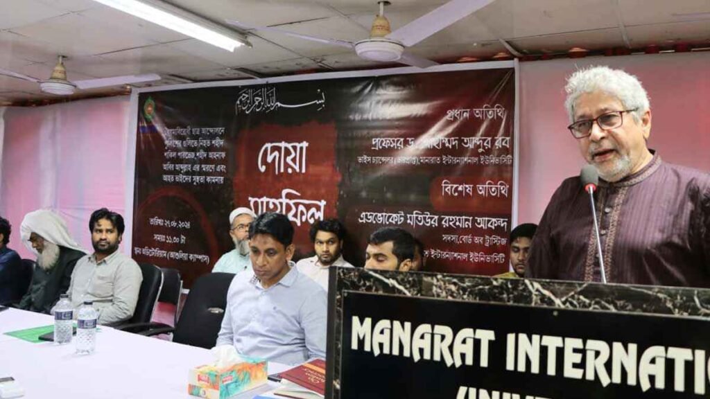 বৈষম্যবিরোধী ছাত্র আন্দোলনে শহীদ শাকিল হোসেন ও আহনাফ আবির আব্দুল্লাহ’র রূহের মাগফেরাত এবং আহতদের সুস্থতা কামনায় মানারাত ইন্টারন্যাশনাল ইউনিভার্সিটিতে দোয়া মাহফিল অনুষ্ঠিত হয়েছে। মঙ্গলবার (২৭ আগস্ট) সকালে বিশ্ববিদ্যালয়টিতে এই মাহফিলের আয়োজন করা হয়।