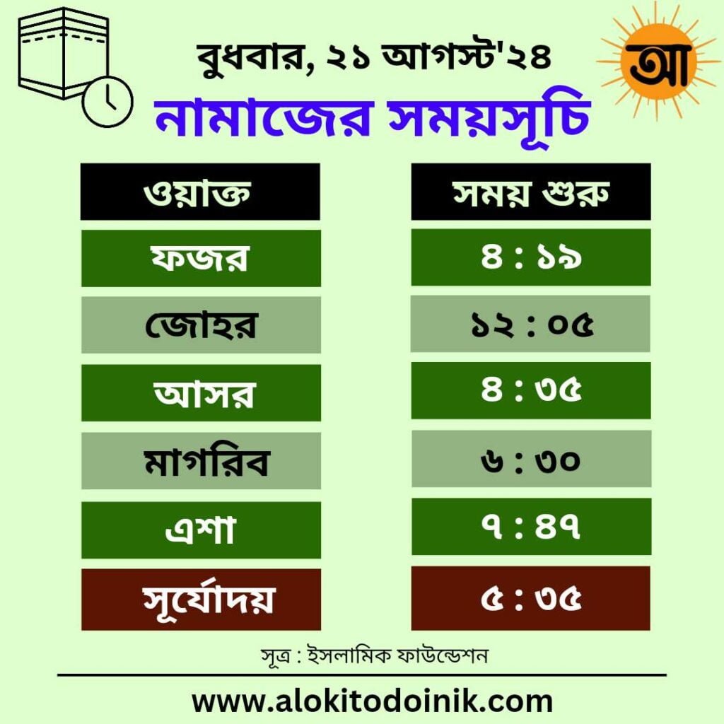 বুধবার, ২১ আগস্ট : নামাজের সময়সূচি