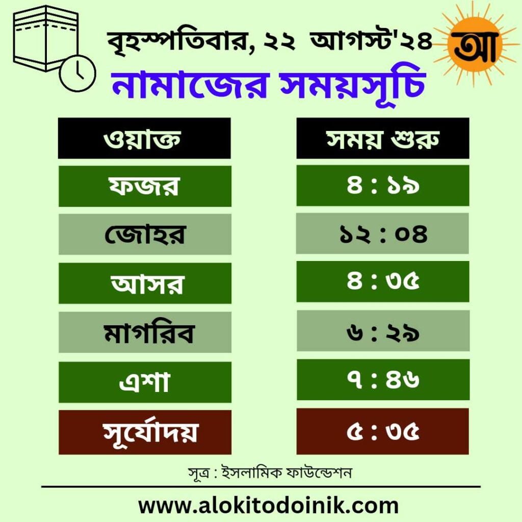 বৃহস্পতিবার, ২২ আগস্ট : নামাজের সময়সূচি