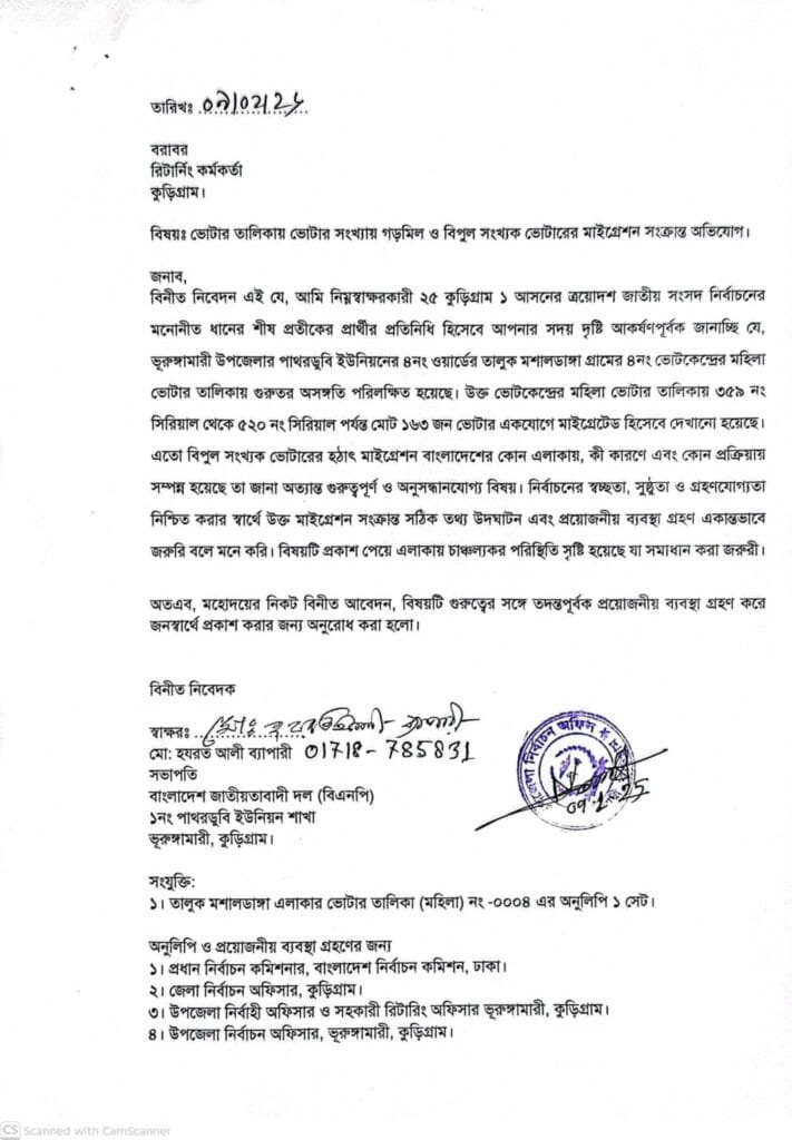 লিখিত অভিযোগ সূত্রে জানা যায়, ভুরুঙ্গামারী উপজেলার পাথরডুবী ইউনিয়নের ৮ নম্বর ওয়ার্ডের তালুক মালালদহা গ্রামের নারী ভোটার তালিকায় অনিয়ম পরিলক্ষিত হয়েছে। ওই গ্রামের নারী ভোটার তালিকার ৩৫৯ নম্বর সিরিয়াল থেকে ৫২০ নম্বর সিরিয়াল পর্যন্ত মোট ১৬২ জন ভোটারকে একযোগে ‘মাইগ্রেটেড’ হিসেবে দেখানো হয়েছে।