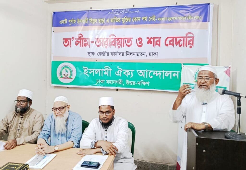ইসলামী ঐক্য আন্দোলন, ঢাকা মহানগরী উত্তর ও দক্ষিণ-এর যৌথ উদ্যোগে কেন্দ্রীয় কার্যালয় মিলনায়তনে গত ২৩ অক্টোবর ২০২৫, বৃহস্পতিবার, রাতব্যাপী বিষয়ভিত্তিক তা’লীম-তারবিয়াত ও শব বেদারী অনুষ্ঠিত হয়। এতে সভাপতিত্ব করেন ঢাকা মহানগরী উত্তরের আমীর মাওলানা মুহাম্মদ মহিব্বুল্লাহ ভূঞা।
