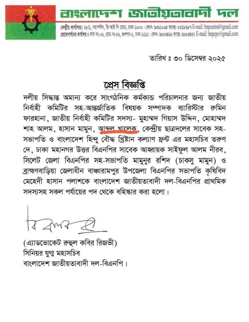 বিএনপির সিনিয়র যুগ্ম মহাসচিব অ্যাডভোকেট রুহুল কবির রিজভীর স্বাক্ষরে প্রকাশিত ওই বিজ্ঞপ্তিতে দলের সকল নেতা-কর্মীদের বহিষ্কৃত ব্যক্তিদের সঙ্গে সাংগঠনিক সম্পর্ক না রাখার নির্দেশনাও দেওয়া হয়েছে।