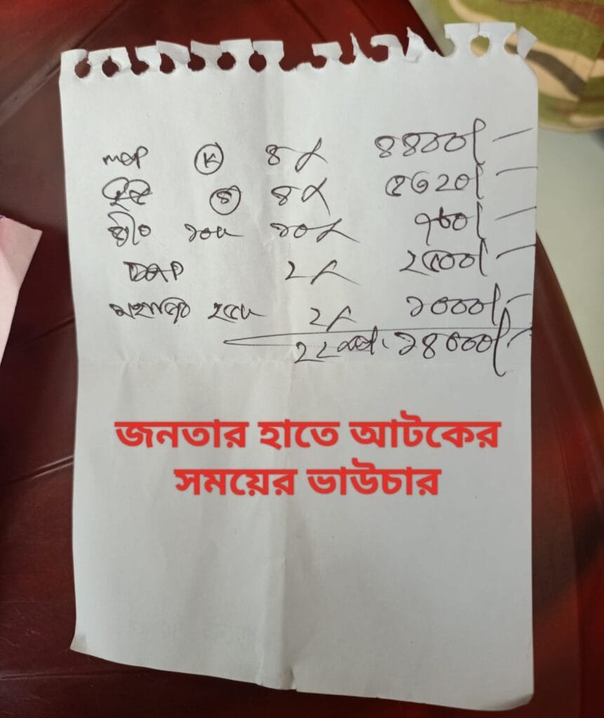 স্থানীয় সূত্রে জানা যায়, অতিরিক্ত দামে সার বিক্রির সময় স্থানীয়রা একটি সারভর্তি চার্জার ভ্যান হাতেনাতে আটক করেন। পরে ভ্যানচালককে জিজ্ঞাসাবাদ করলে তিনি জানান, জিতু-সামসুলের দোকান থেকে প্রতি বস্তা ইউরিয়া ১ হাজার ৩৩০ টাকা, এমওপি ১ হাজার ১০০ টাকা, ডিএপি ১ হাজার ২৫০ টাকা, জিপসাম ৭৮০ টাকা ও মহাজীব ১ হাজার টাকা দরে সার কেনা হয়েছে। এ সময় এসব দামের ভাউচার জব্দ করা হয়।